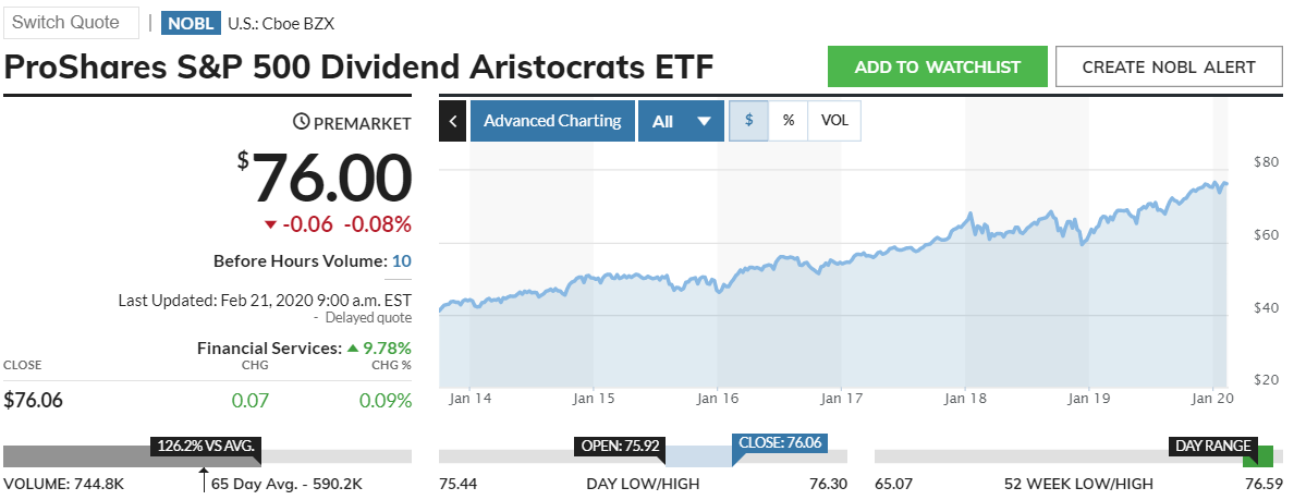 기사에 소개된 2개의 ETF입니다. ProShares S&P 500 Dividend Aristocrats ETF [NOBL] 은 S&P500에 속한 57개 기업으로 구성되어 있는 ETF입니다. 최소 25개년 연속으로 배당을 증가시켜온 기업들을 선정해서 투자하고 있습니다. SPDR S&P Dividend ETF [SDY]도 NOBL과 같은 철학을 가진 배당주 ETF입니다.