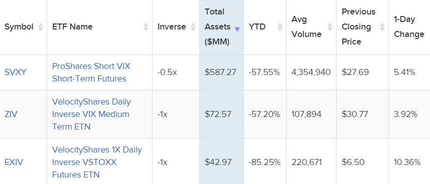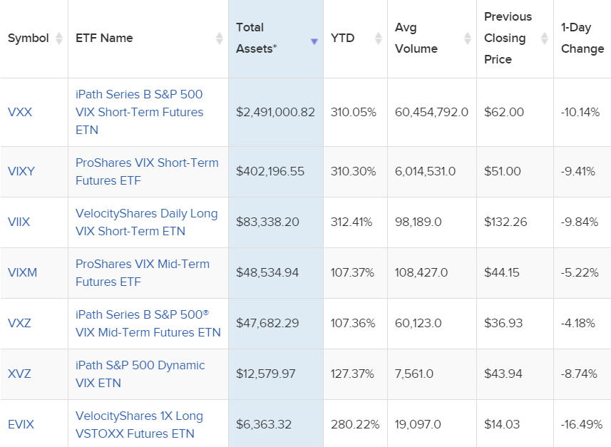아래는 주요 VIX관련 ETF들입니다. 올해 수익률을 보시면 VIX관련 ETF(ETN)의 특징을 쉽게 이해할 수 있습니다. 가장 큰 규모로 거래되는 상품은 iPath S&P 500 VIX Short-Term Futures ETN (VXX)입니다.