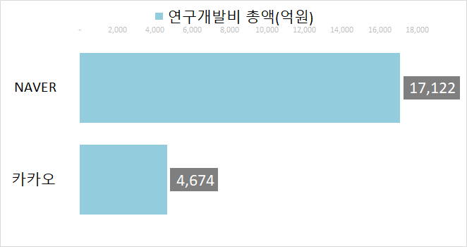 2019년도 두 기업의 연구개발비 현황입니다. 회사의 규모 만큼 NAVER의 연구개발비가 1.7조원으로 3배 이상 높습니다. 매출액 대비 연구개발비를 보더라도 NAVER가 26.0%로 카카오의 15.2% 대비 더 많은 연구개발비를 사용 중입니다.