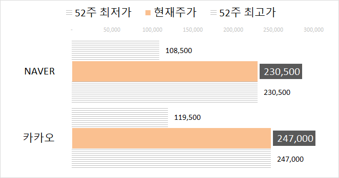 2017년 카카오 주가부진 이후 최근에는 성장성에 주목한 카카오의 주가 상승이 좀 더 가파르게 나타났습니다.