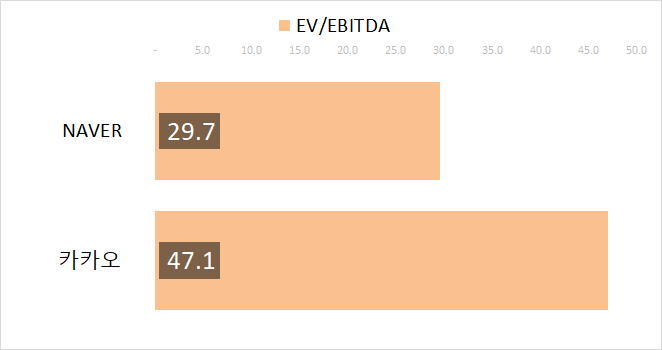EV/EBITDA의 경우 NAVER가 29.7배, 카카오가 47.1배입니다. 카카오의 EV/EBITDA는 38배 수준인 아마존(Amazon.com) 보다도 더 높아졌습니다.