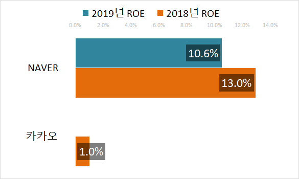 카카오는 전년도 적자였고 네이버의 경우 과거 평균 10~20%의 높은 ROE를 유지했습니다.