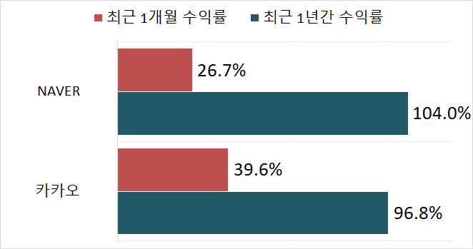 최근 1달간 네이버는 27%, 카카오는 40% 가량 올랐고 1년간 수익률은 두 종목 모두 100% 수준입니다.