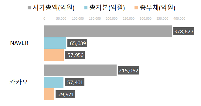 네이버 시가총액은 37.9조원, 카카오는 21.5조원입니다. 총자본 대비로는 네이버가 5.8배, 카카오가 3.7배로 카카오가 좀 더 자산가치에 대해 높은 평가를 받고 있습니다. 부채비율은 네이버 89.1%, 카카오 52.2%로 모두 안정적입니다.