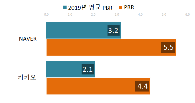 PBR 기준으로는 네이버가 5.5배, 카카오가 4.4배로 두 기업 모두 과거 밸류에이션 구간의 상단에 온 모습입니다.