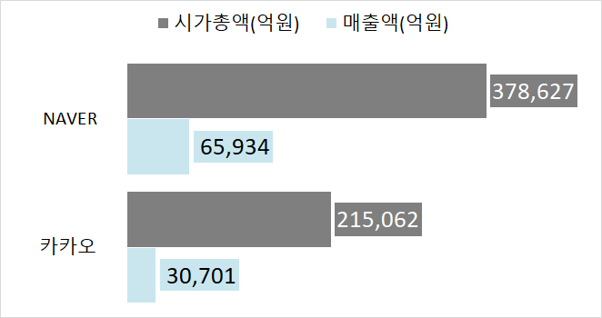 매출액은 네이버가 카카오의 2배 이상인 6.6조원 정도이며 매출액 대비 시가총액은 카카오가 7.0배로 네이버 5.7배보다 높습니다.