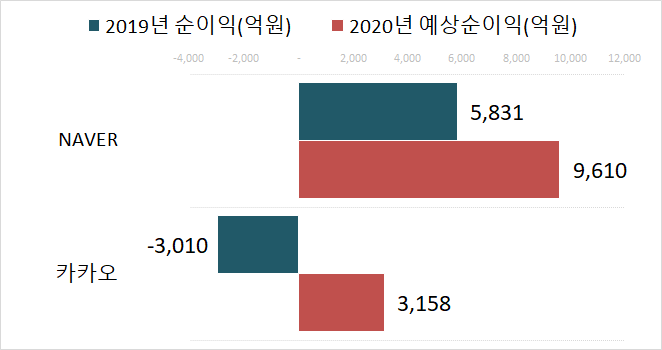 올해 예상 순이익은 네이버가 9,610억원, 카카오가 3,158억원으로 모두 전년도 이익규모를 크게 넘어섭니다.