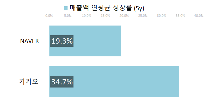 최근 5년간 매출액 성장률은 카카오가 34.7%로 더 높은 성장을 보여주고 있습니다. 상대적으로 매출액 대비 시가총액이 높은 이유이기도 합니다.