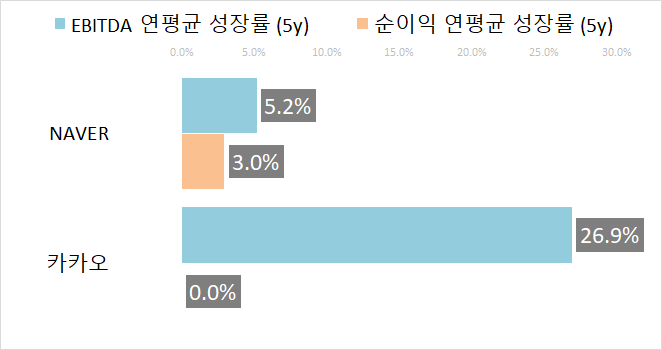 EBITDA의 연평균 성장률 역시 카카오가 26.9%로 높습니다. 카카오 순이익의 경우 전년도 영업권 상각 등의 영향으로 적자였습니다.