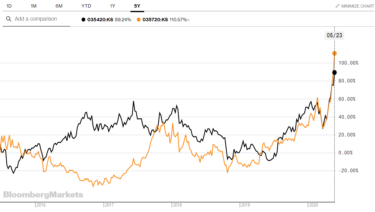 사업영역을 제외한 재무제표의 수치들을 기준으로 한 NAVER와 카카오에 대한 비교 내용입니다. 최근 언텍트 모멘텀으로 두 종목 모두 주가 상승을 지속하고 있고 5년 기준으로 카카오는 100%가 넘는 주가 상승이 있었습니다.