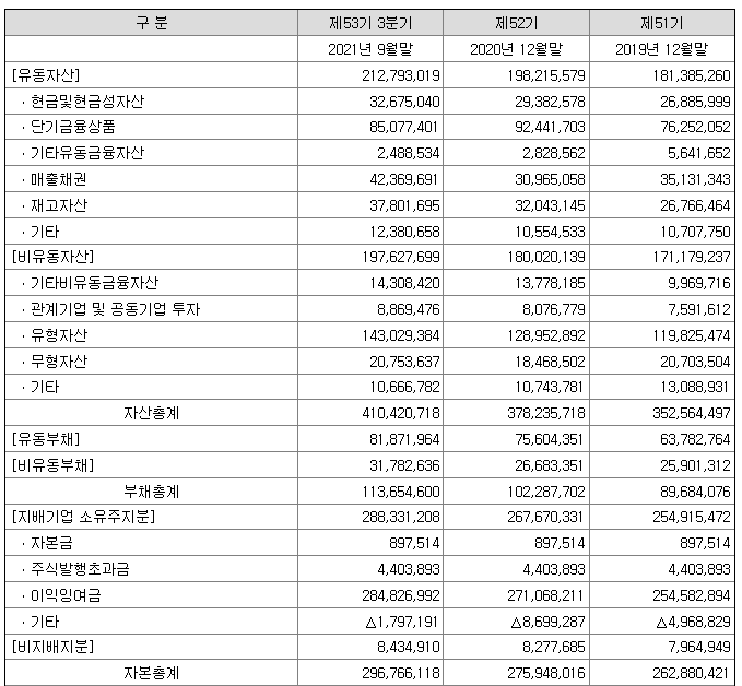 그 7억 원이 순자산이 되고 아래 삼성전자의 재무제표와 같이 기업의 경우에는 자본금, 주식발행 초과금, 이익잉여금 등을 합한 자본총계로 표현됩니다.