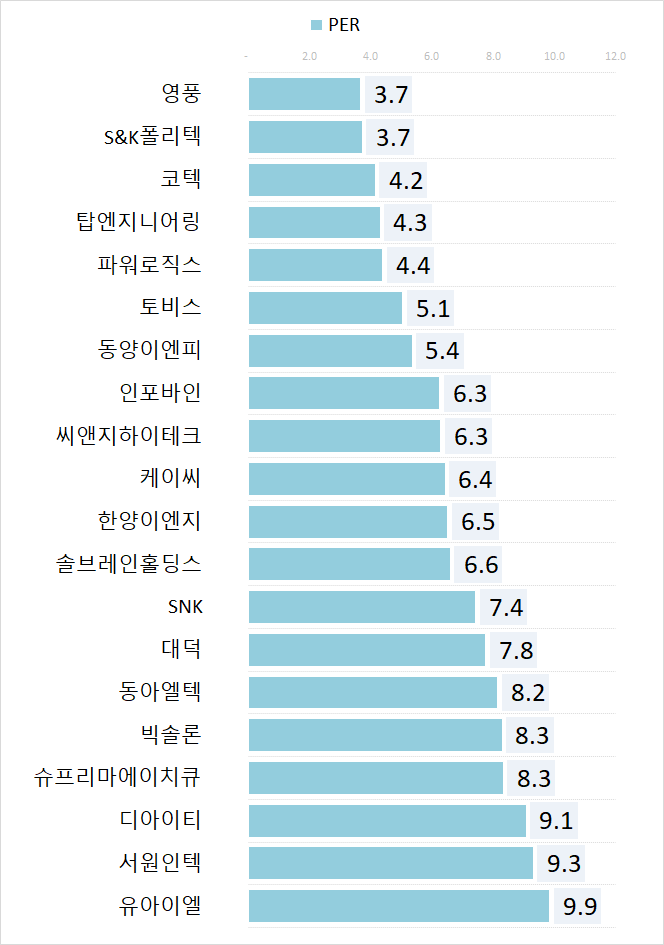 해당 기업들을 PER 순으로 정리했습니다. 영풍부터 유아이엘까지 20개 종목이 포함됩니다. S&K폴리텍, 코텍, 탑엔지니어링, 파워로직스, 토비스, 동양이엔피, 인포바인, 씨엔지하이테크, 케이씨, 한양이엔지, 솔브레인홀딩스, SNK, 대덕, 동아엘텍, 빅솔론, 슈프리마에이치큐, 디아이티, 서원인텍 등의 종목이 있습니다.