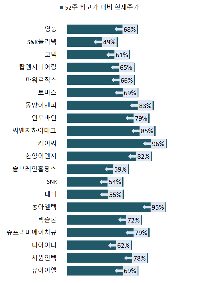 52주 최고가 대비 현재주가의 수준입니다. S&K폴리텍은 최고가 대비 절반 이하의 주가입니다. SNK, 대덕도 최고가 대비 50%대의 주가에 머물고 있습니다.