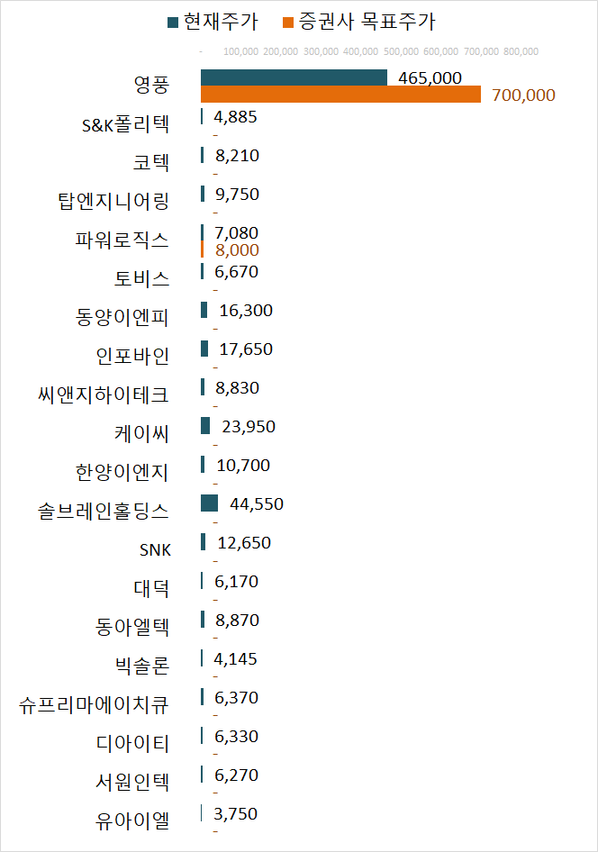 현재주가와 증권사 목표주가가 있는 경우 목표주가를 비교한 표입니다. 영풍의 현재 주가는 465,000원 증권사 목표주가는 700,000원으로 상당한 차이를 보이고 있습니다. 그 외 목표주가가 있는 종목은 파워로직스가 있습니다.