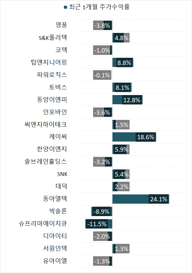 최근 1개월간 주가는 동아엘텍, 케이씨, 동양이엔피가 10% 이상 상승해서 추세를 전환하는 모습입니다. 동아엘텍의 주각 수익률이 가장 뛰어납니다. 찾아보니 2분기 실적이 좋았네요.