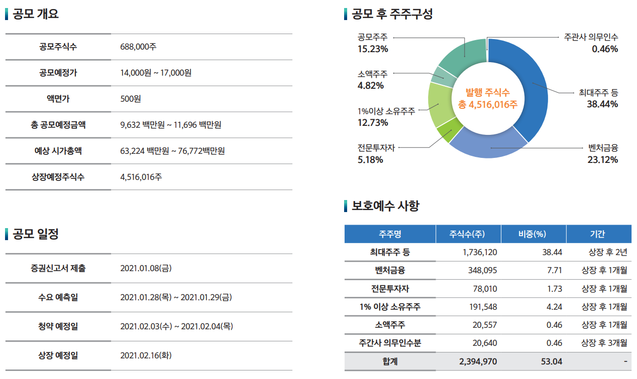 그리고 공모일정을 보면 기관투자자들의 수요예측이 1월 28~29일까지이고 개인들이 참여하는 청약예정일은 2월 3~4일 양일간임을 알 수 있습니다. 해당일에 맞춰 청약증거금을 준비해야 합니다. 그리고 상장일은 2.16일로 청약을 받은 투자자들은 2월 16일부터 시장에서 거래(매도)를 할 수 있습니다.