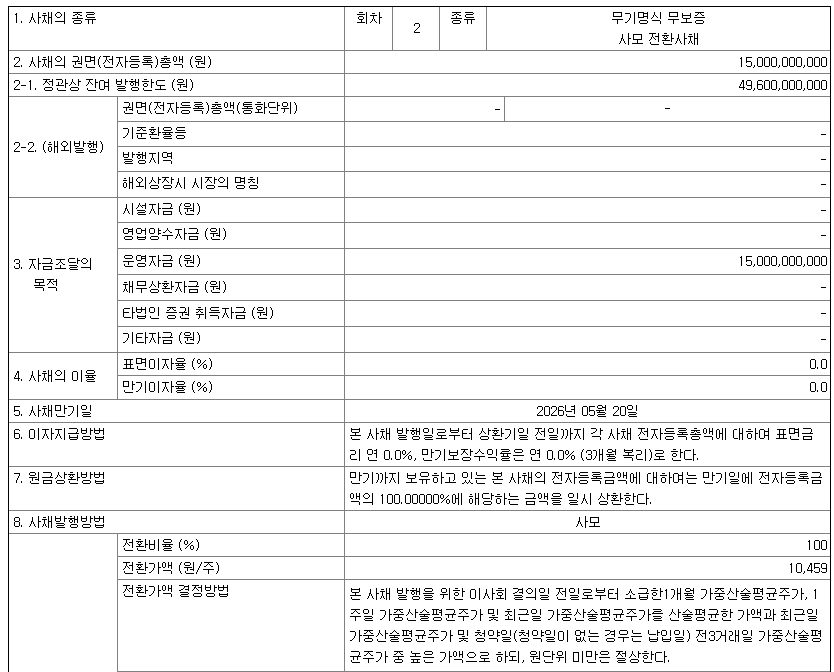 그래서 전환사채는 일반 채권보다 좀 더 낮은 금리로 발행할 수 있는 장점이 있습니다. 투자자 입장에서도 주식 전환을 염두에 두고 전환사채를 투자하는 경우가 일반적이라 금리 조건보다는 주식 전환가액과 조건 등이 더 중요한 투자 결정요소입니다.