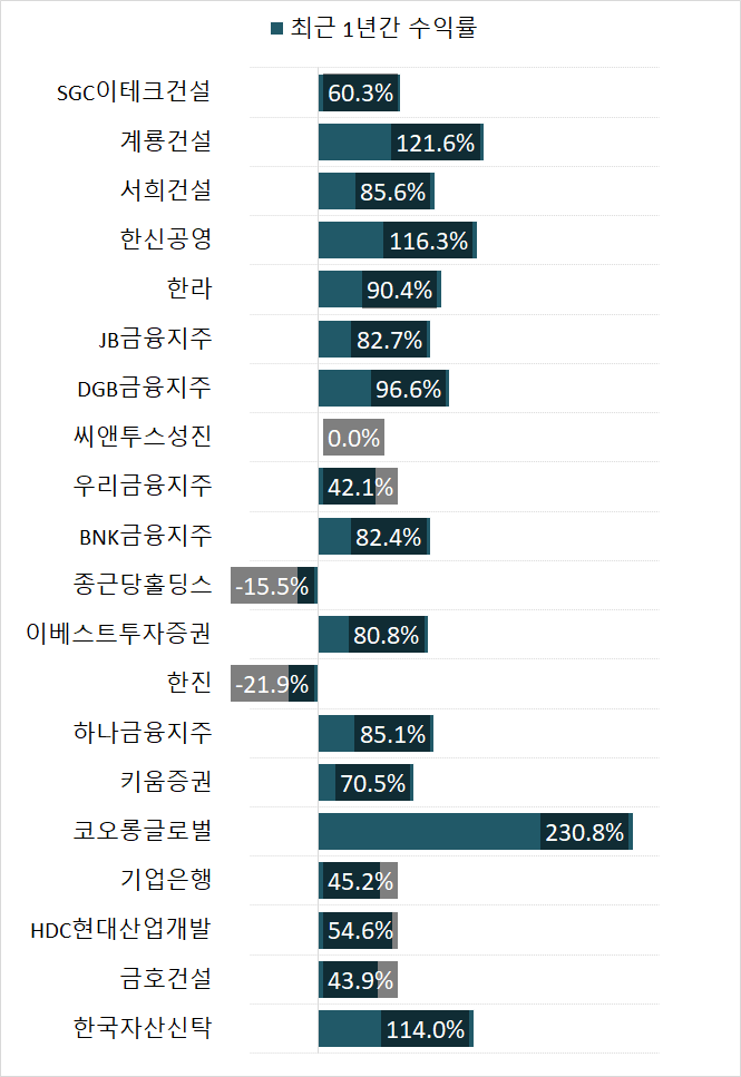 해당 기업은 'SGC이테크건설(시총 1188억원), 계룡건설(시총 3067억원), 서희건설(시총 4734억원), 한신공영(시총 3077억원), 한라(시총 2239억원), JB금융지주(시총 15561억원), DGB금융지주(시총 15798억원), 씨앤투스성진(시총 2184억원), 우리금융지주(시총 80171억원), BNK금융지주(시총 26400억원), 종근당홀딩스(시총 5586억원), 이베스트투자증권(시총 4793억원), 한진(시총 5904억원), 하나금융지주(시총 137811억원), 키움증권(시총 33005억원), 코오롱글로벌(시총 6680억원), 기업은행(시총 79037억원), HDC현대산업개발(시총 18948억원), 금호건설(시총 3828억원), 한국자산신탁(시총 6167억원)' 의 순입니다.