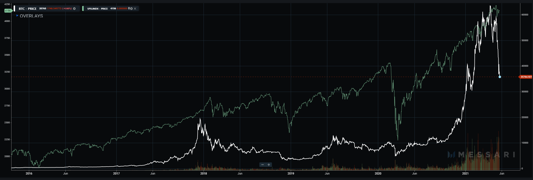 아래는 가상화폐의 기축통화격인 Bitcoin과 S&P500의 추이를 2016년부터 나타낸 그래프입니다. 시장 전체 유동성의 영향 때문인지 장기추세에서는 주식시장과 가상화폐간의 유사한 흐름이 관측됩니다. 2018년과 2019년의 시장 충격과 2020년 팬데믹 이후 급락과 반등 국면의 추이가 장기적으로 제법 비슷한 모습을 보이고 있습니다.