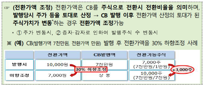 하지만 증권시장 불법, 불건전행위 근절 종합대책의 후속으로 금융위원회가 전환사채(CB)와 관련한 '증권의 발행 및 공시 등에 관한 규정' 개정안을 의결함에 따라 12월 1일부터 주가 상승 시 전환가액 상향조정 의무화가 시행되게 되었습니다.