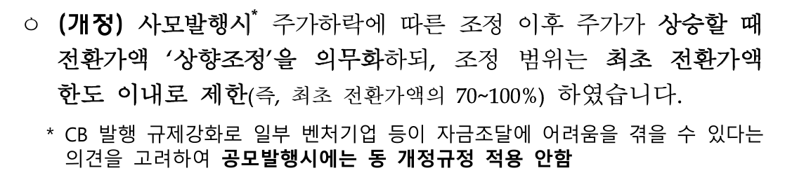개정안은 CB 사모발행 시(공모발행 시에는 적용 제외) 주가하락에 따라 전환가액 하향조정 이후 주가가 재 상승하게 되면 전환가액 상향조정을 의무화하는 것을 담고 있습니다. 조정 범위는 최초 전환가액 한도 이내로 제한 (최초 전환가액의 70~100%) 입니다.