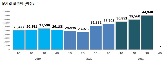 2021년 3분기 매출액 4조 4,948억원으로 전년 동기 대비 42.5% 증가, 영업이익은 2,096억 원으로 500.1% 증가, 순이익은 1,205억 원으로 383.3% 증가했습니다.