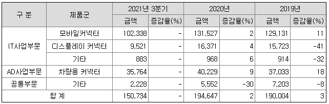 사업은 크게 IT사업부문과 AD사업부문으로 나뉘는데 IT사업부문은 모바일, 디스플레이용 초정밀 커넥터를 생산, 판매하는 사업이며, AD 사업부문은 차량용 커넥터 사업부문입니다.
