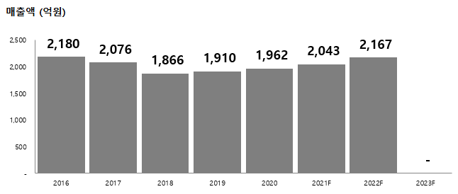 2020년 매출액은 1,962억 원이었고 올해 예상 매출액은 2,043억 원, 2022년 예상 매출액은 2,167억 원으로 소폭 증가를 전망하고 있습니다.