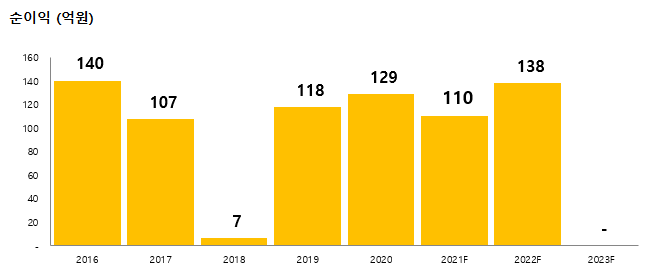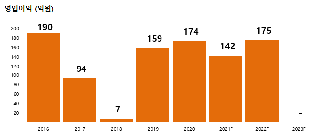 영업이익은 연간 150억 원 정도는 낼 수 있는 체력이 있어 보입니다. 2020년 174억 원의 영업이익을 창출했고 2021년과 2022년은 142억 원과 175억 원을 전망하고 있습니다.