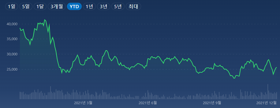 올해 1분기 4만원대에서 3만 원 이하로 하락한 이후 25,000원선의 주가를 장기간 횡보하고 있습니다.