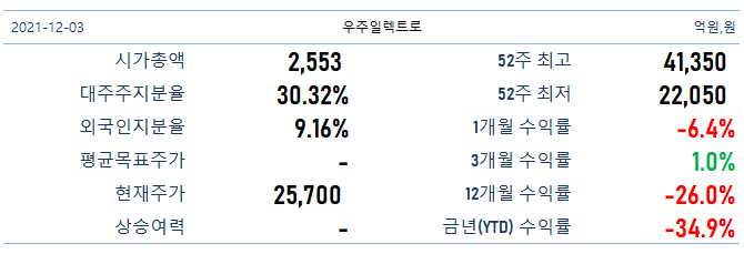 12월 3일 기준 우주일렉트로 주가는 25,700원, 시가총액은 2,553억 원입니다. 52주 최고/최저가는 41,350원과 22,050원으로 현재 주가는 52주 최저가에 가까이에 있습니다.