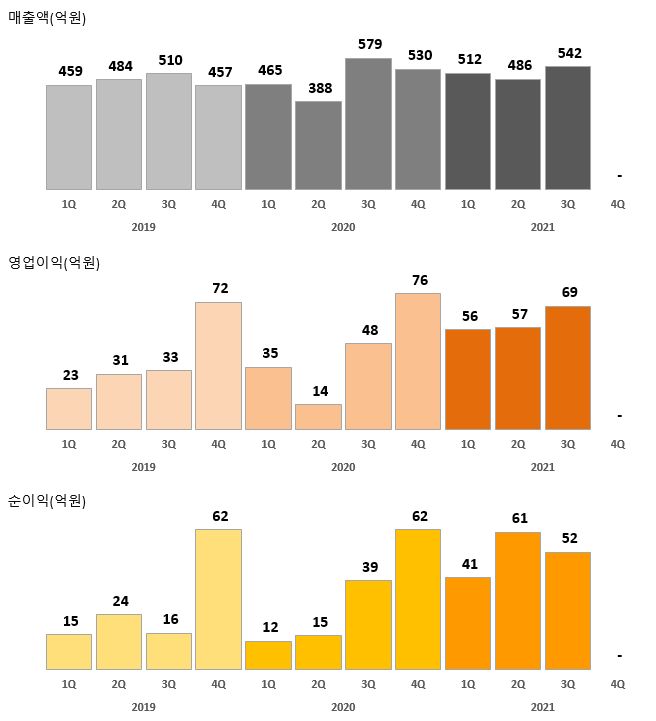2021년 3분기 말 누적 매출액은 1,541억 원 영업이익 183억 원, 순이익 154억 원으로 전년 동기와 대비해서 양호한 실적 흐름을 유지하고 있습니다.