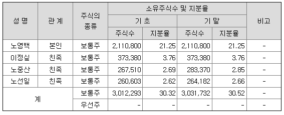 최대주주는 1949년생 노영백 대표이사로 21.25% 지분을 보유하고 있으며 가족 등 특수관계인 포함 30.32%의 지분을 보유하고 있습니다.
