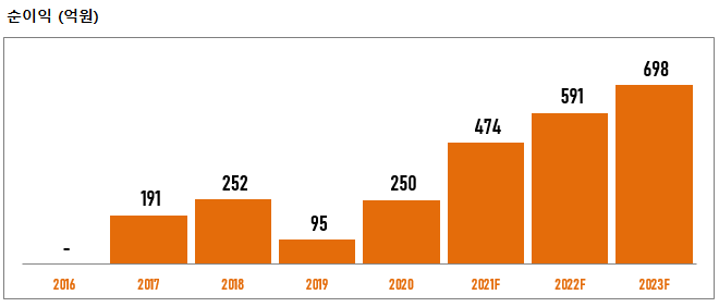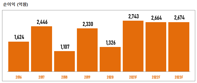 2020년 순이익 1,326억 원에서 2021년 2,743억 원, 2022년 2,664억 원으로 성장 전망하고 있습니다.