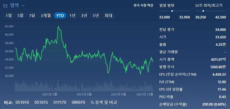 현재 주가는 33,400원으로 과거 12개월 실적 기준 PER 12.0배, 향후 12개월 추정실적 기준 PER 8.3배에서 거래 중입니다. 시가총액은 4,211억 원으로 올해 수익률은 -4.7%, 최근 1개월 수익률은 7.9% 였습니다.