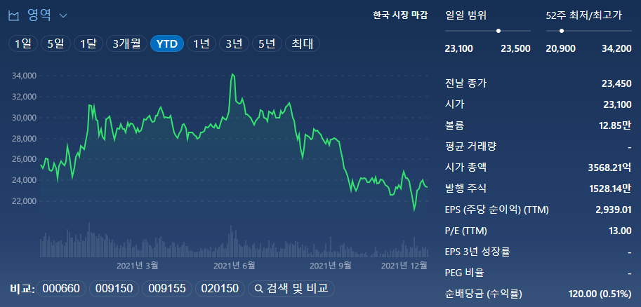 전년도 배당금 120원 기준 현재 배당수익률은 0.5% 입니다. 증권사들의 평균 목표주가는 35,000원으로 현재 주가 대비 약 50% 이상 상승여력이 있습니다.