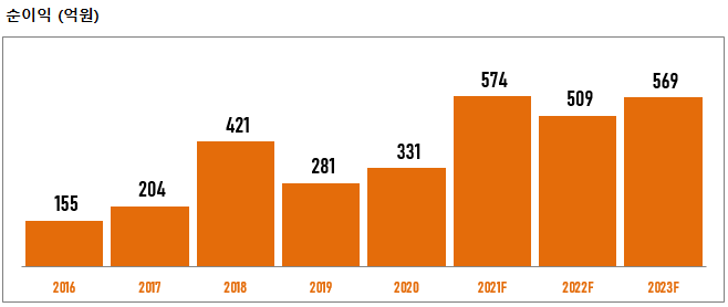 2020년 순이익은 331억원, 2021년 574억 원, 2022년 509억 원으로 전망하고 있습니다.