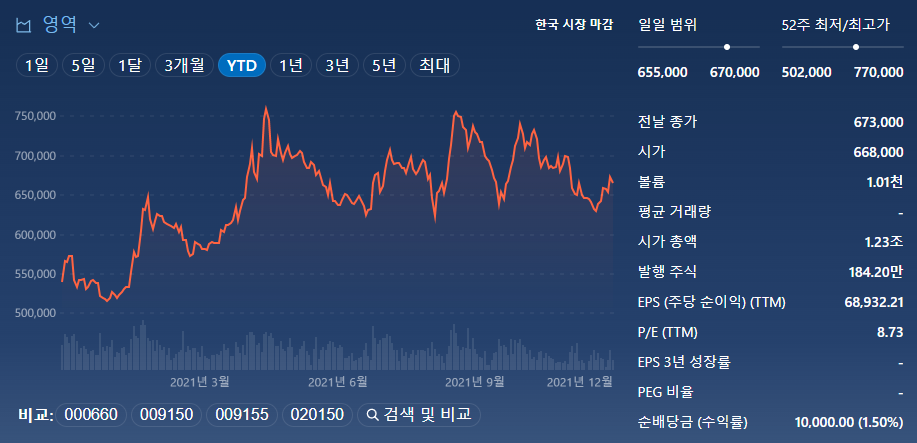 현재 주가는 666,000원으로 과거 12개월 실적 기준 PER 8.7배, 향후 12개월 추정 PER 기준 4.6배에서 거래되고 있습니다. 올해 주가 수익률은 23.8%, 최근 1개월간은 -2.1%로 횡보 중입니다.