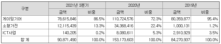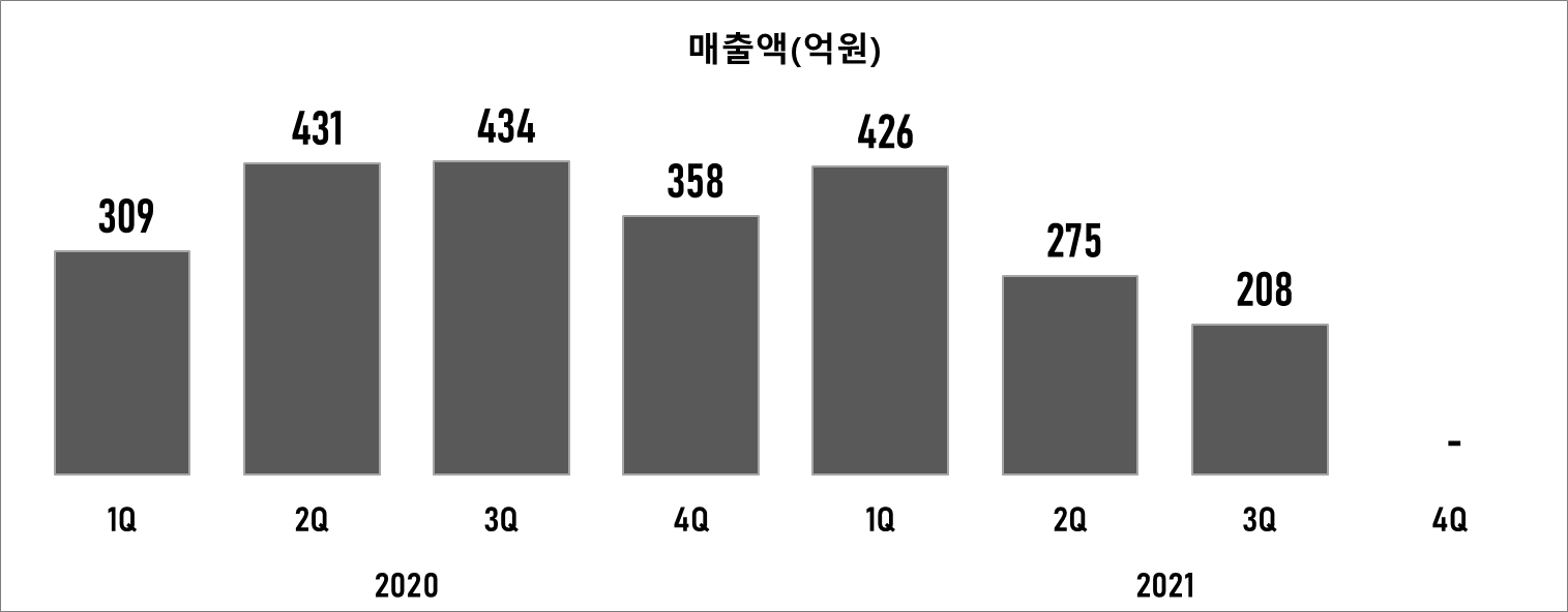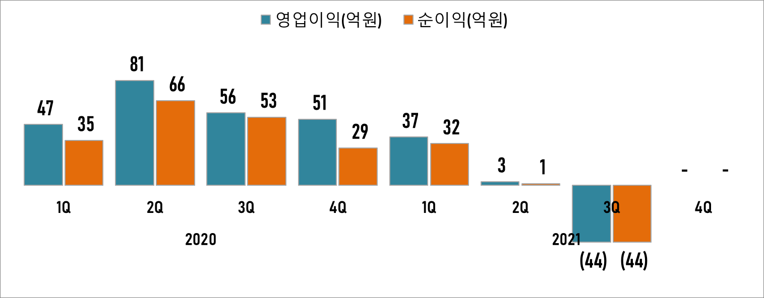 코로나 장기화로 게이밍기어의 주 수요처인 피시방 영업이 정상화되지 못한 상황 때문으로 추측됩니다. 지난 3분기에는 전년 동기 대비 절반 수준의 매출과 함께 영업이익 -44억 원을 기록했습니다.
