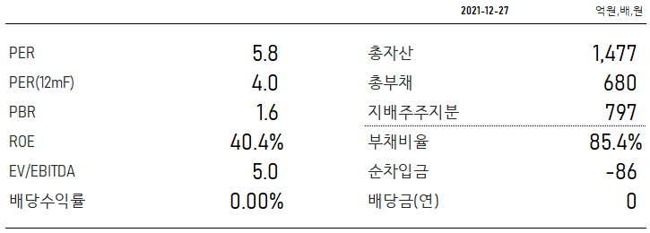 PBR 1.6배, EV/EBITDA 5.0배이며, 총 자산 1,477억 원, 부채비율 85.4%, 순현금 상태입니다. 향후 배당금 지급 계획은 있는 것으로 알려져 있습니다.