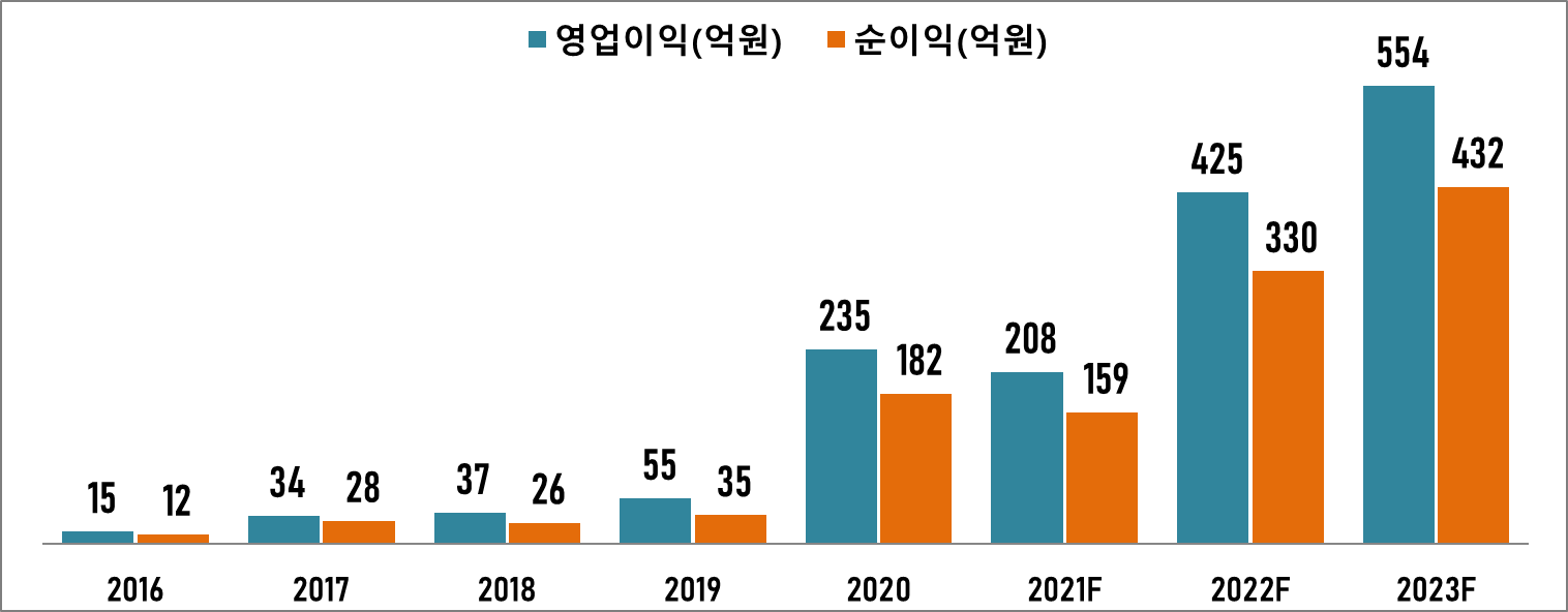 2020년 상장 첫해 영업이익 235억 원, 순이익 182억 원을 기록하였으며, 2022년 내년도 예상 영업이익은 425억 원, 순이익은 330억 원입니다. 전망대로 300억 원대의 순이익을 거둔다면 현재 1,300억 원대의 시가총액은 매우 낮아 보입니다.