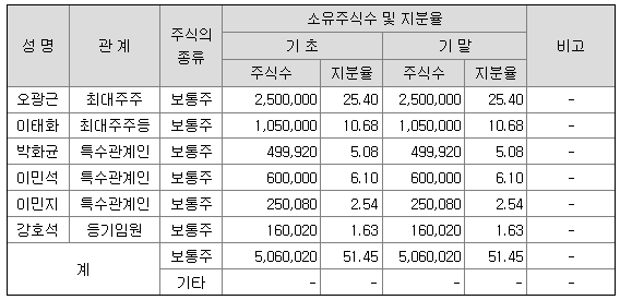 앱코 최대주주는 대표이사인 73년생 오광근 대표로 본인 지분 25.4%, 특수관계인 포함 시 51.45%의 지분을 보유 중입니다. 공동 창업자인 이태화 대표는 10.68%의 지분을 보유 중입니다.