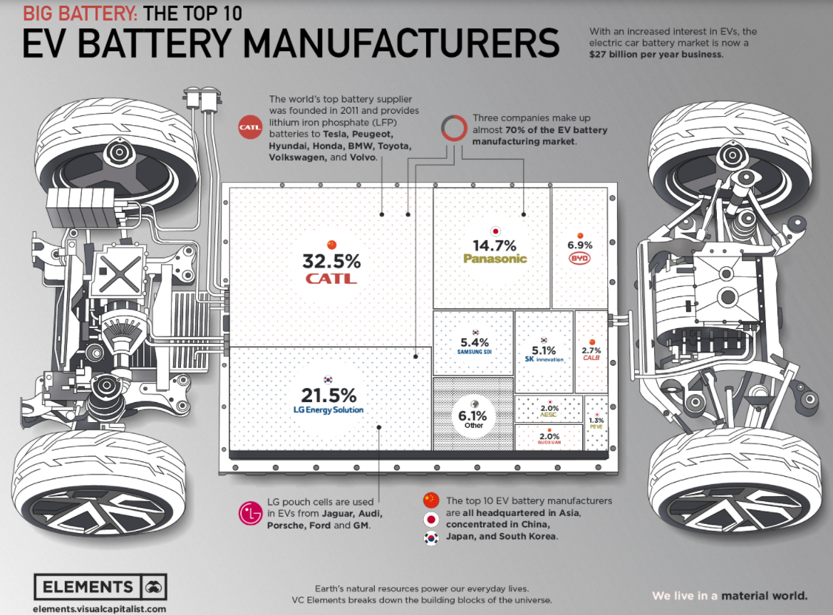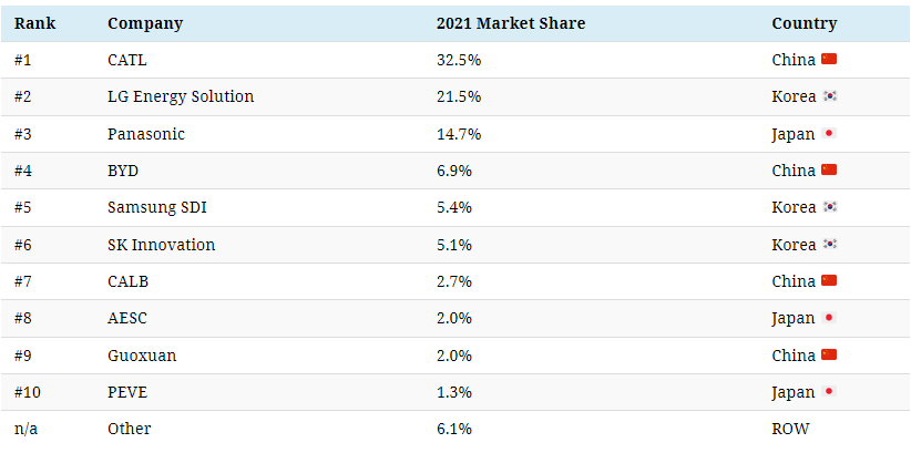 현재 EV 배터리 시장은 아시아 국가들에서 장악 중입니다. 중국의 CATL이 32.5%, LG에너지솔루션이 21.5%, 일본의 파나소닉이 14.7%로 시장의 70%를 이 3개 기업이 차지하고 있습니다.