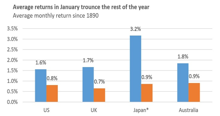 1월의 평균 수익률을 보더라도 미국의 경우 1.6%로 다른달의 0.8%보다 두배 가까운 수익률을 보였습니다. 일본의 경우 1월 평균 수익률이 3.2%로 다른 달의 0.9%보다 2% pt이상 높습니다.