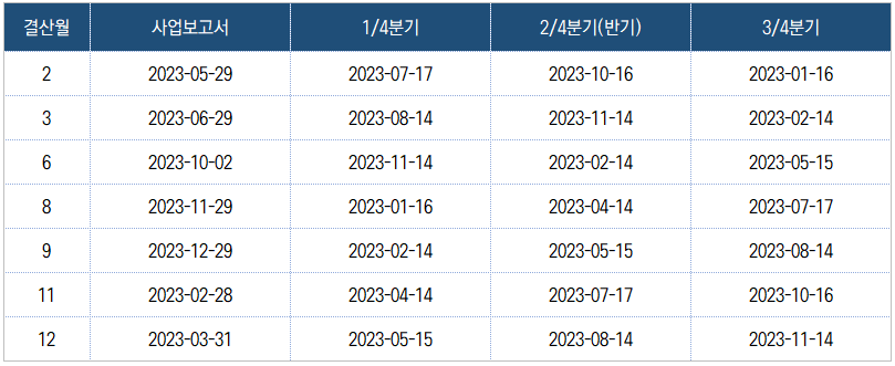 2023년 정기보고서(사업보고서, 분기보고서, 반기보고서) 제출기한