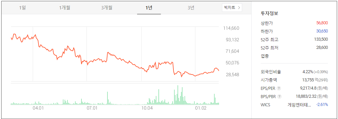 | 5 | 펄어비스 | 46,750 | -3.6 | -51.4 | 27.4 | 0 |