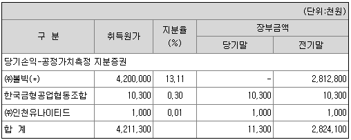 기타투자자산(11,300,000원)의 경우 별도와 연결모두 동일한 기준으로 금융자산으로 인식하고 있습니다.