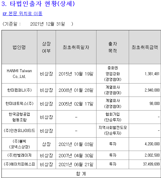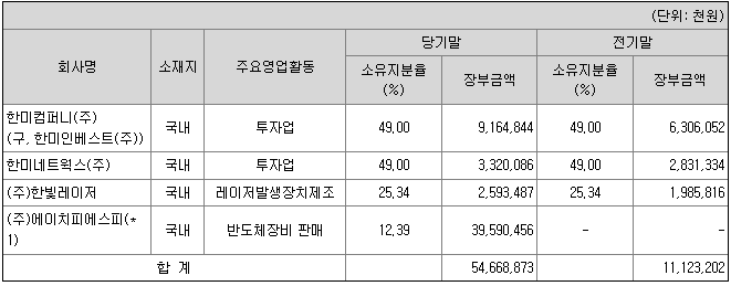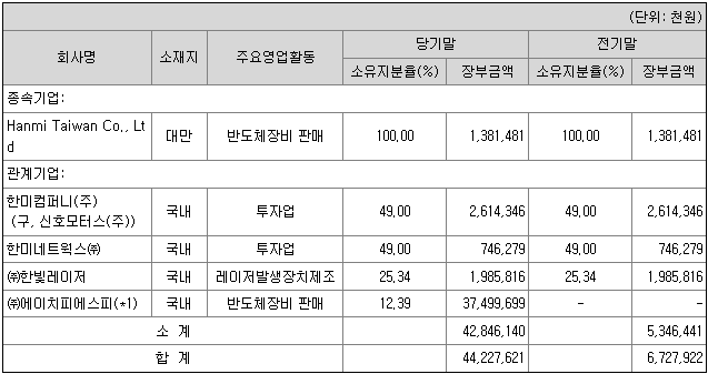 아래는 사업보고서에 있는 타법인 출자현황입니다. 여기에는 한미반도체의 종속기업과 지분법으로 인식되는 관계기업 등이 모두 나와있습니다. 이들 기업이 어떻게 구분되는지 하나씩 보겠습니다.