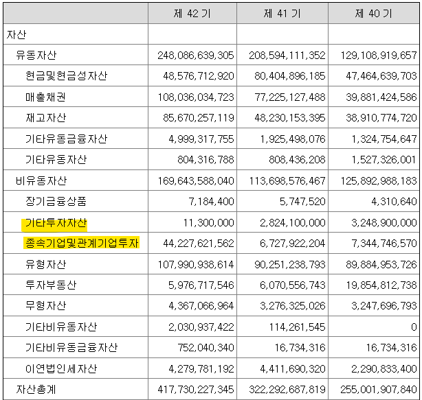 마찬가지로 주석의 기타투자자산 11,300천원이 연결 재무제표에서도 같은 항목의 동일금액으로 기표된 것을 확인할 수 있습니다.