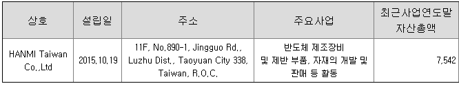 사업보고서의 상세표 연결대상 종속회사 현황을 보면 연결로 인식되는 종속기업이 확인됩니다. 한미반도체의 경우 지분 100%를 보유한 한미타이완 하나뿐입니다.